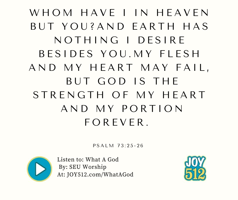 Today’s joyful verse comes from Psalm 73:25-26 and says “Whom have I in heaven but you? And earth has nothing I desire besides you. My flesh and my heart may fail, but God is the strength of my heart and my portion forever.” As you read and pray through this verse, check out “What A God” by SEU Worship on JOY 512!