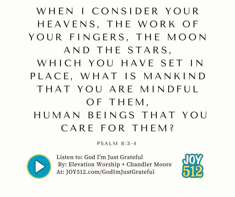Today’s joyful verse comes from Psalm 8:3-4 and says “When I consider your heavens, the work of your fingers, the moon and the stars, which you have set in place, what is mankind that you are mindful of them, human beings that you care for them.” As you read and pray through this verse, check out “God I’m Just Grateful” by Elevation Worship and Chandler Moore on JOY 512!