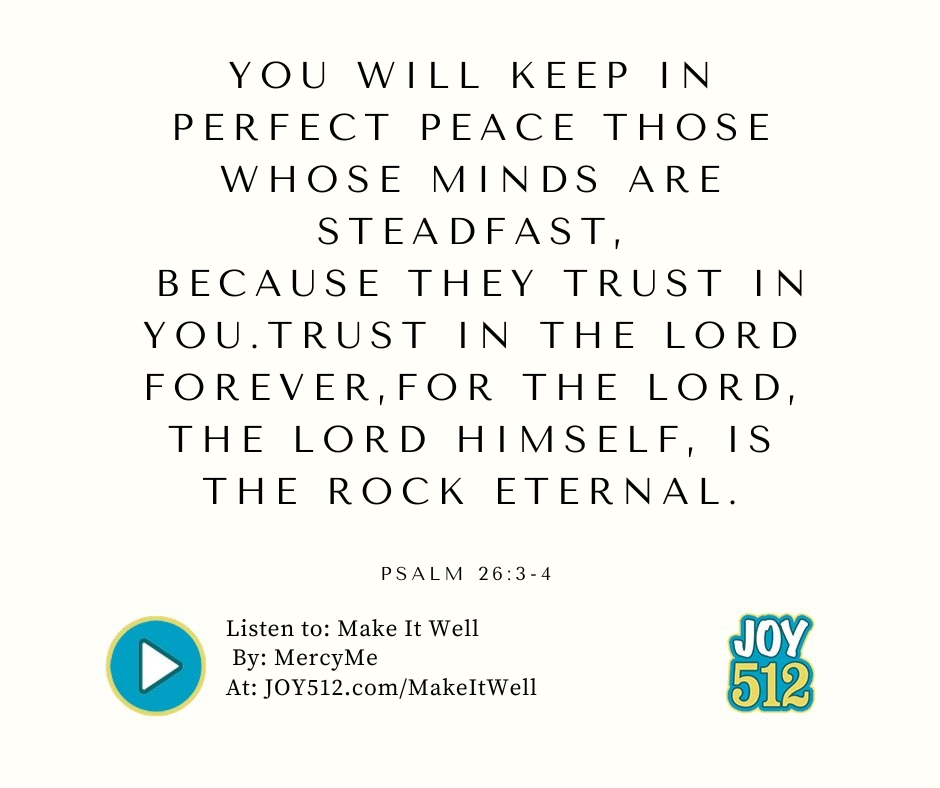 Today’s joyful verse comes from Psalm 26:3-4 and says “You will keep in perfect peace those whose minds are steadfast, because they trust in you. Trust in the Lord forever, for the Lord, the Lord himself, is the Rock eternal.” As you read and pray through this verse, check out “Make It Well” by MercyMe on JOY 512!