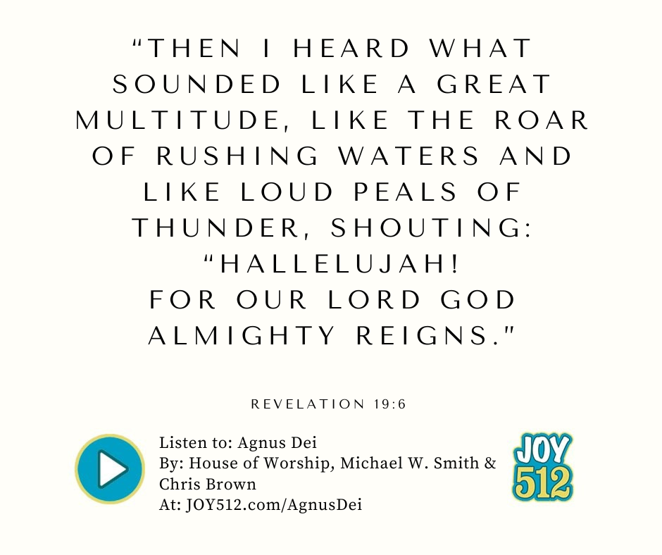 Today’s joyful verse comes from Revelation 19:6 and says “Then I heard what sounded like a great multitude, like the roar of rushing waters and like loud peals of thunder, shouting: “Hallelujah! For our Lord God Almighty reigns.” As you read and pray through this verse, check out “Agnus Dei” by House of Worship, Michael W. Smith & Chris Brown on JOY 512!