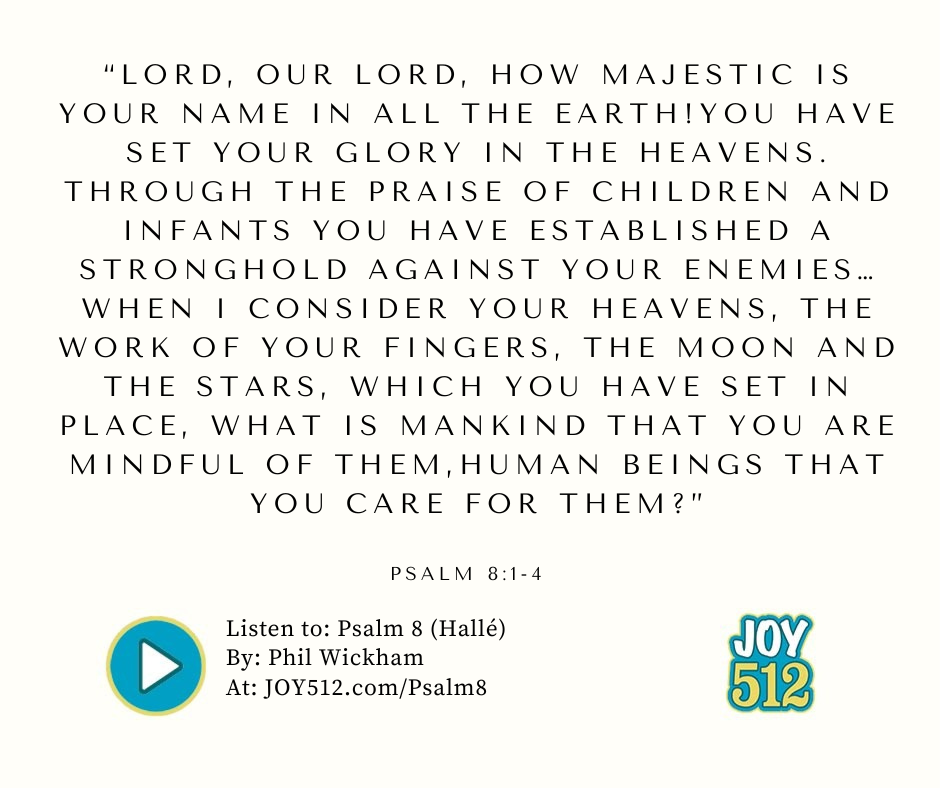 Today’s joyful verse comes from Psalm 8:1-4 and says “Lord, our Lord, how majestic is your name in all the earth! You have set your glory in the heavens. Through the praise of children and infants you have established a stronghold against your enemies… When I consider your heavens, the work of your fingers, the moon and the stars, which you have set in place, what is mankind that you are mindful of them, human beings that you care for them?”As you read and pray through this verse, check out “Psalm 8 (Hallé)” by Phil Wickham on JOY 512!
