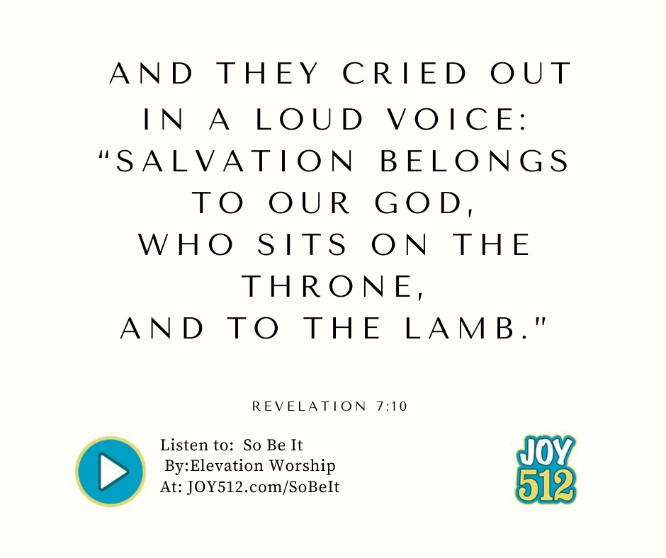 Today’s joyful verse comes from Revelation 7:10 and says “And they cried out in a loud voice: “Salvation belongs to our God, who sits on the throne, and to the Lamb.” As you read and pray through this verse, check out “So Be It” by Elevation Worship on JOY 512!