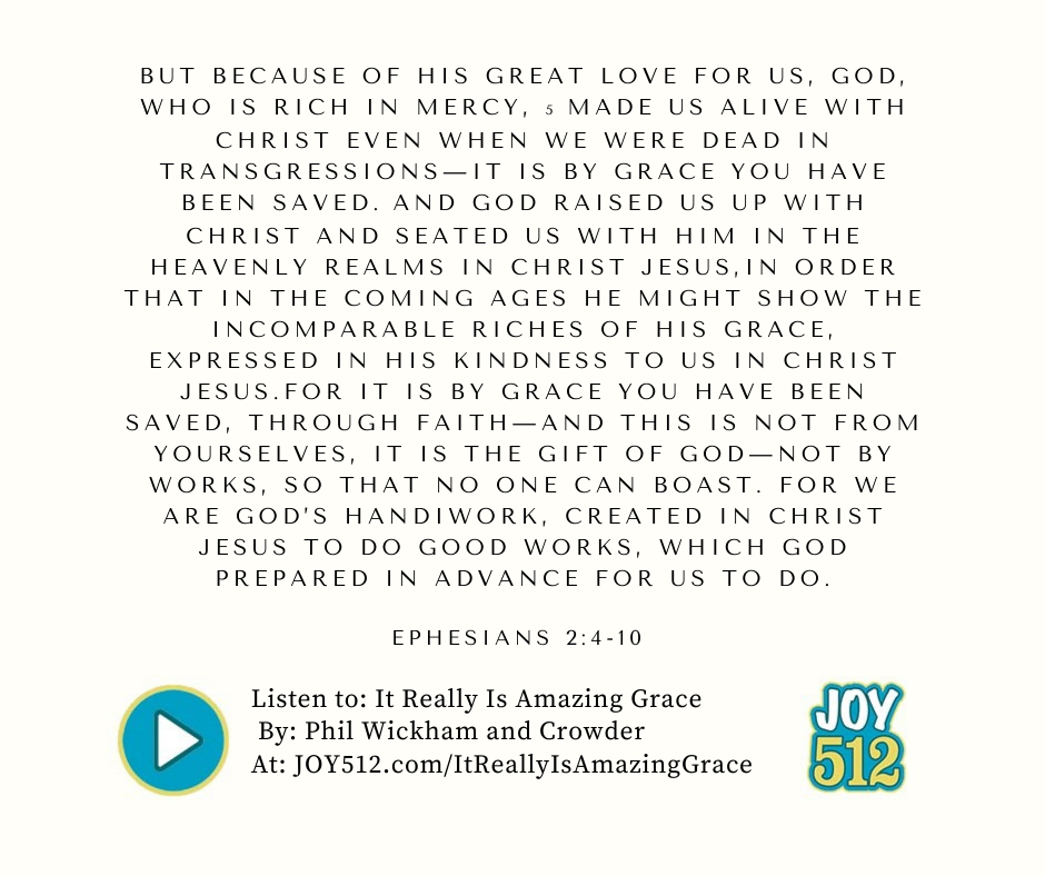 Today’s joyful verse comes from Ephesians 2:4-10 and says “But because of his great love for us, God, who is rich in mercy, made us alive with Christ even when we were dead in transgressions—it is by grace you have been saved. And God raised us up with Christ and seated us with him in the heavenly realms in Christ Jesus, in order that in the coming ages he might show the incomparable riches of his grace, expressed in his kindness to us in Christ Jesus. For it is by grace you have been saved, through faith—and this is not from yourselves, it is the gift of God— not by works, so that no one can boast. For we are God’s handiwork, created in Christ Jesus to do good works, which God prepared in advance for us to do.” As you read and pray through this verse, check out “It Really Is Amazing Grace” by Phil Wickham and Crowder on JOY 512!